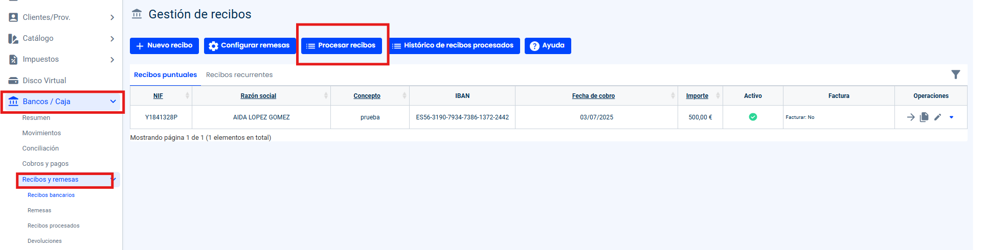 Para crear una remesa hay que acceder al apartado «Crear remesa» que se encuentra en el menú lateral o bien, dentro del listado de recibos en el botón «Procesar recibos«.