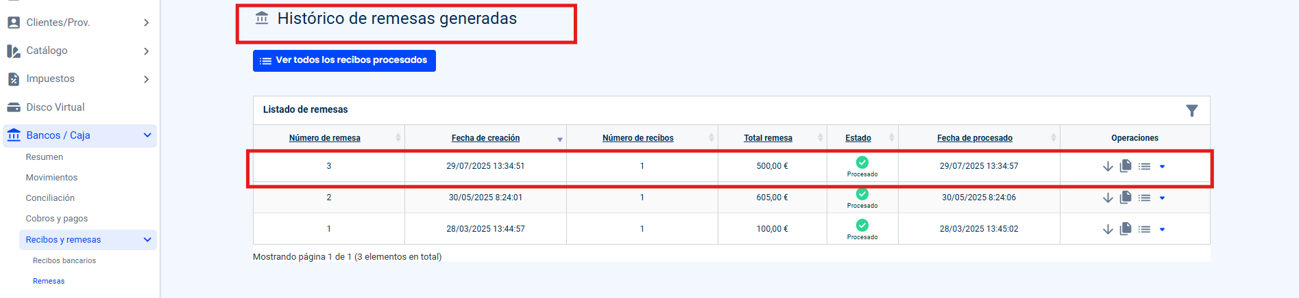 Tu remesa ya ha sido creada y podrás consultar su estado en el apartado histórico de remesas, de donde podrás descargar el fichero bancario 19.14 listo para subirlo a tu banco habitual.