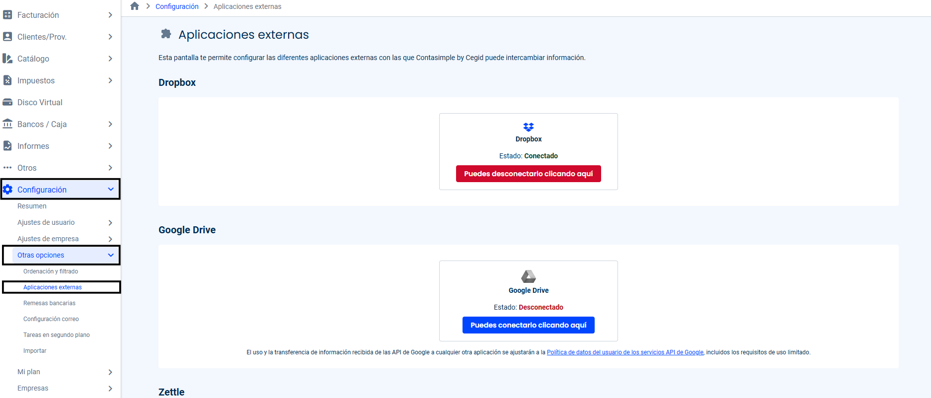 Para generar la APIKEY, primero debes acceder a Contasimple, en el menú lateral izquierdo buscar Configuración, ve a Otras opciones y selecciona Aplicaciones Externas.