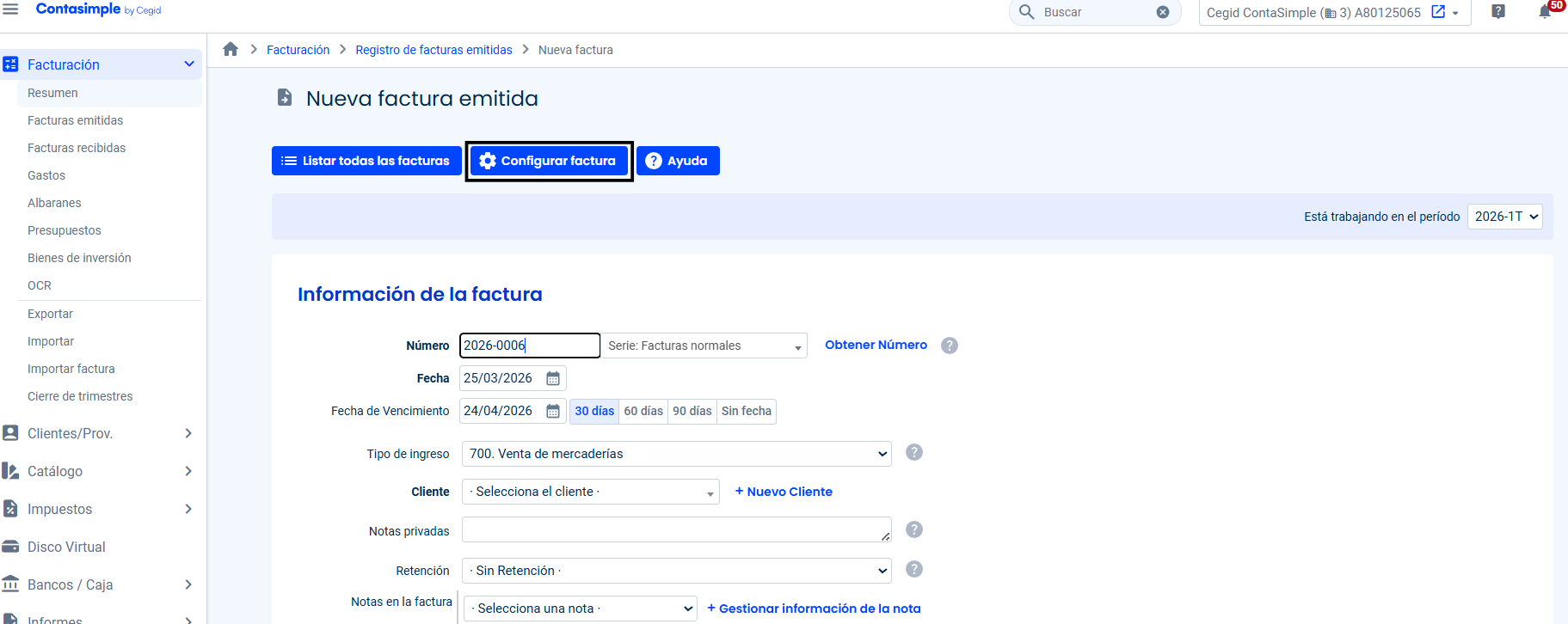 Para acceder a la configuración de tus facturas, inicia sesión en Contasimple, ve a Facturación en el menú lateral izquierdo, selecciona Facturas Emitidas y clica en Nueva Factura:
