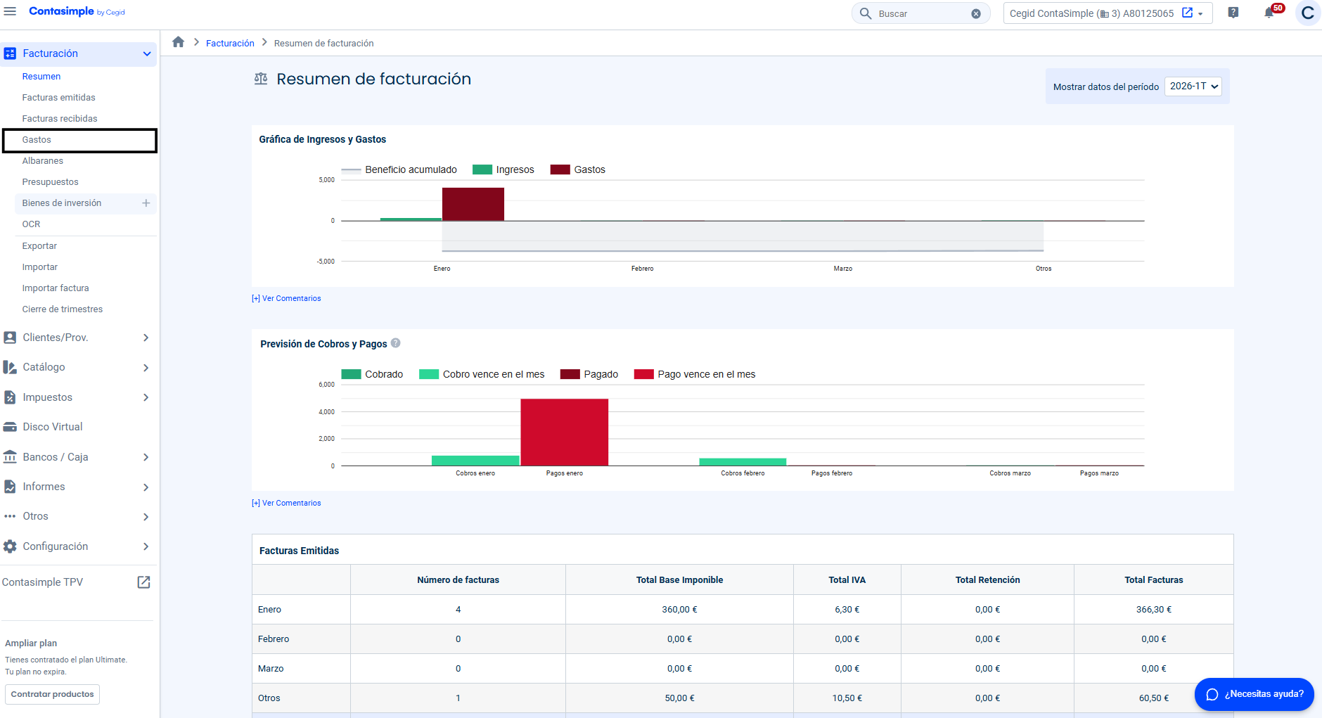 Accede a la pestaña de Contasimple del menú superior. Haz clic en la pestaña Gastos del menú lateral de Facturación tal y como se muestra en la imagen.