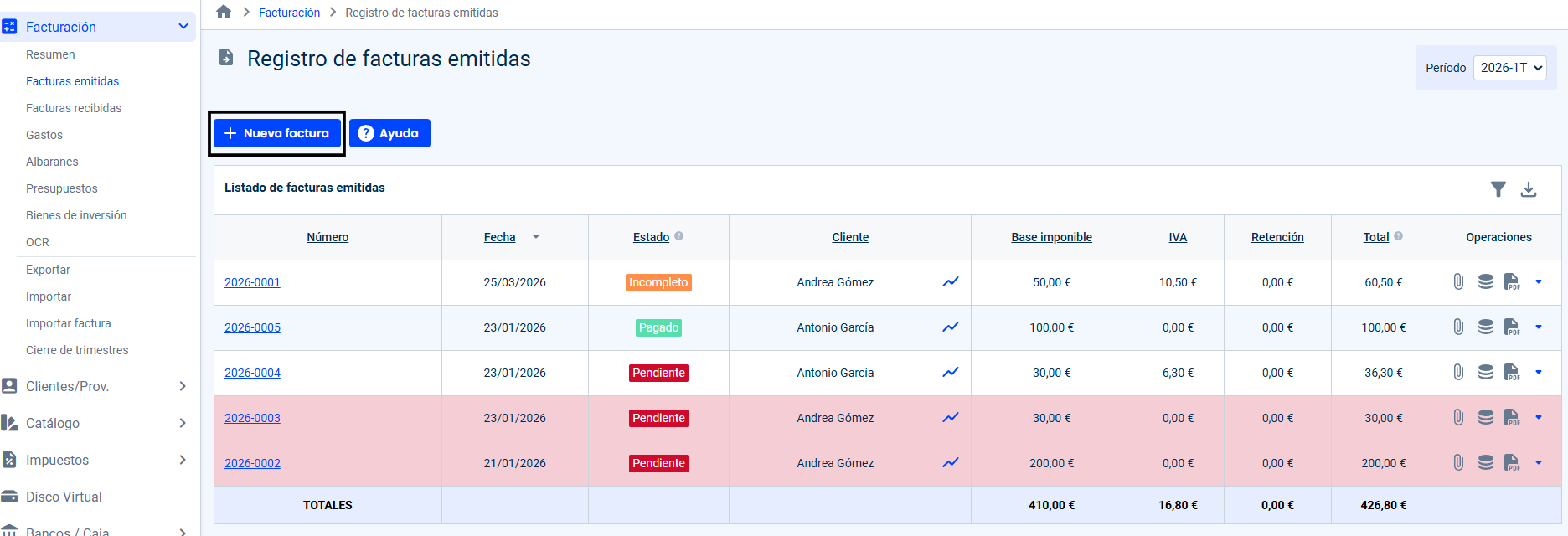 2 – Accede al listado de facturas emitidas desde la opción del menú Facturación-> Facturas emitidas.