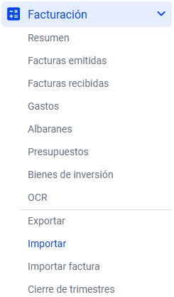 Para ello, haz clic en la pestaña “Facturación” del menú superior de la pantalla de inicio. Una vez dentro , haz clic en “Importar” en el menú lateral izquierdo.