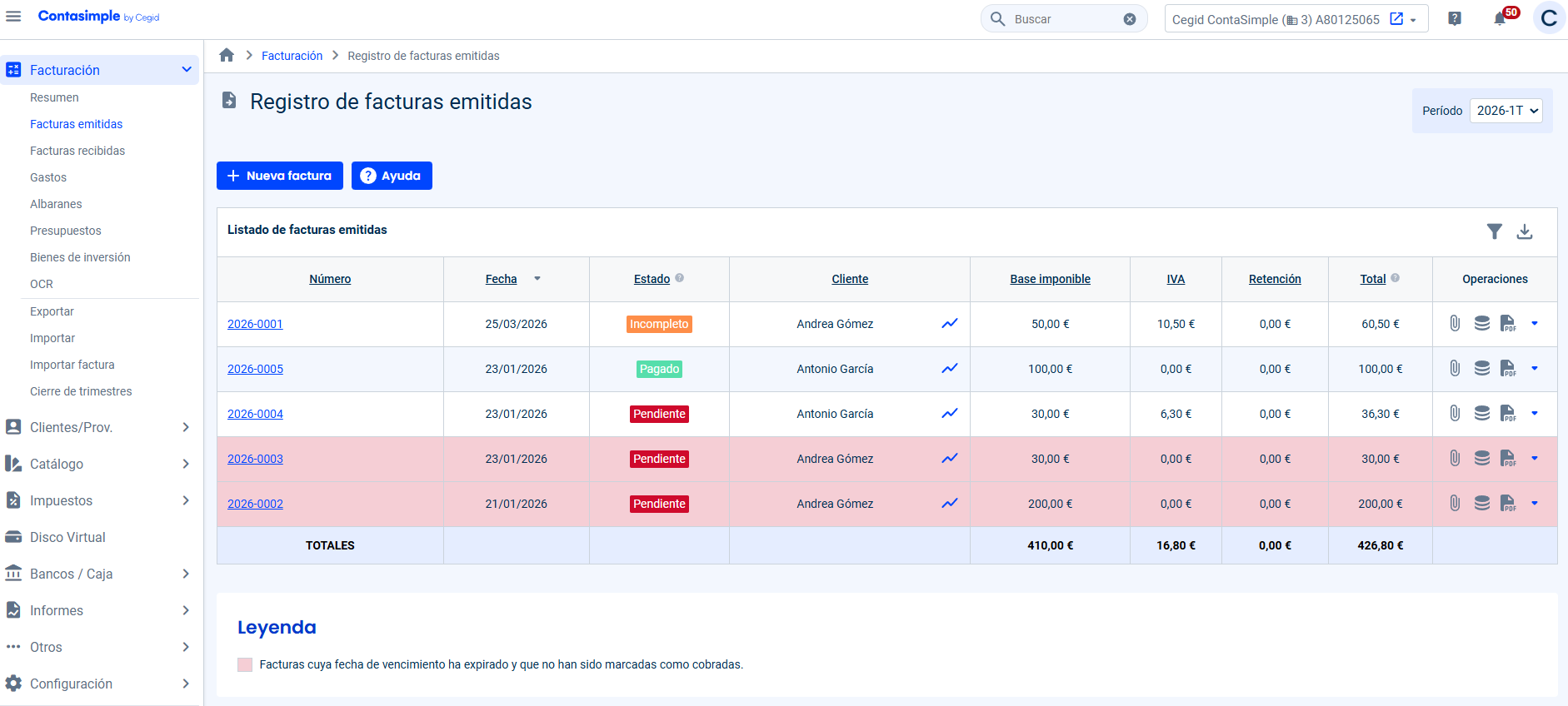 Desde allí se pueden crear nuevos apuntes para cada factura emitida, o bien emitirlas directamente desde Cegid Contasimple y enviarlas a los clientes por correo electrónico, o también imprimirlas y entregarlas de forma física.