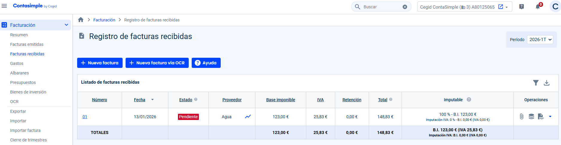 En el caso de Cegid Contasimple puede accederse a este libro de registro desde la pestaña de Contabilidad, haciendo click en el enlace de Facturas Recibidas.