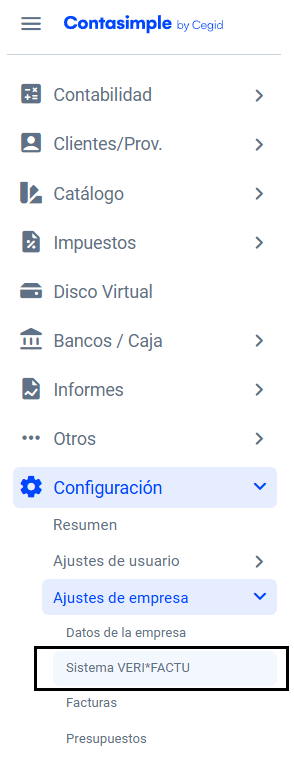 Accede a en el menú lateral izquierdo. Haz clic en «Configuración» -> «Ajustes de empresa» -> «Sistema VERI*FACTU»